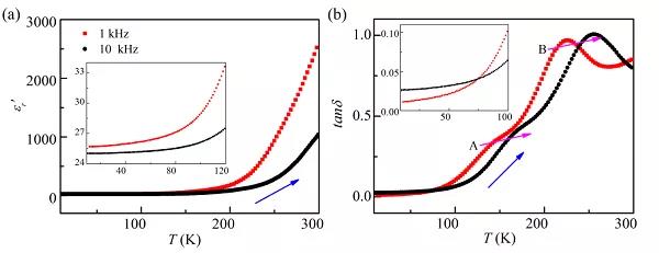 圖3 CaCu3Fe2Ta2O12在1 kHz和10 kHz時(shí)(a) 介電常數(shù)和(b) 介電損耗的溫度依賴(lài)性。