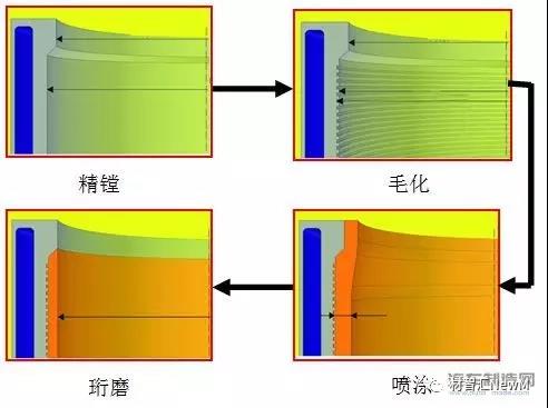 通過與國(guó)外噴涂廠家的交流,我們?cè)囍屏藝娡扛左w,掌握了等離子噴涂的工藝流程:缸孔精鏜—缸孔毛化—清洗—缸孔噴涂—過噴涂處理—最終珩磨。在此,對(duì)噴涂工藝的關(guān)鍵工序(見圖2)展開分析。
