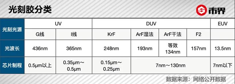 一定程度上來說,光刻出的電路圖案越精密,就代表著芯片性能越好。采用不同的光刻光線,對應地需要搭配不同的光刻膠。目前,根據(jù)不同的光波長,光刻膠大致可以分為G線、I線、KrF、ArF、EUV這幾類。