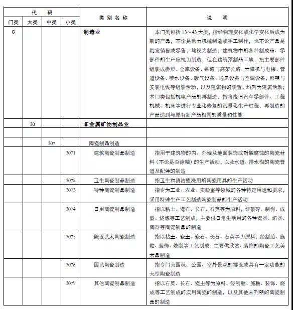 下表中節(jié)選了中國國標(biāo)分類表中的部分條目,例如大類30為非金屬礦物制品業(yè),其中類307為陶瓷制品制造,第四級小類分類3071到3079為陶瓷制品下屬的子類。從小類3071到3076分為為:建筑陶瓷制品制造,衛(wèi)生陶瓷制品制造;特種陶瓷制品制造;日用陶瓷制品制造;陳設(shè)藝術(shù)陶瓷制造。不容易歸類的統(tǒng)一劃到小類3079其他陶瓷制品。