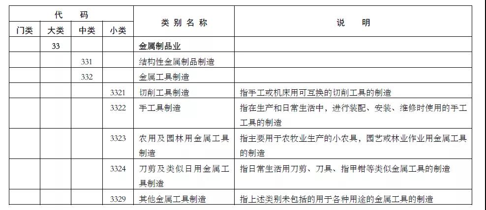 再比如二級分類(大類)中33是金屬制品業(yè),其下面的三級分類(種類)332金屬工具制造中,3321切削工具制造就已經(jīng)是該分類目錄中第四級的最終分類了。然而,對于業(yè)內(nèi)的從業(yè)者來說,這個分類實(shí)在是太粗糙了。