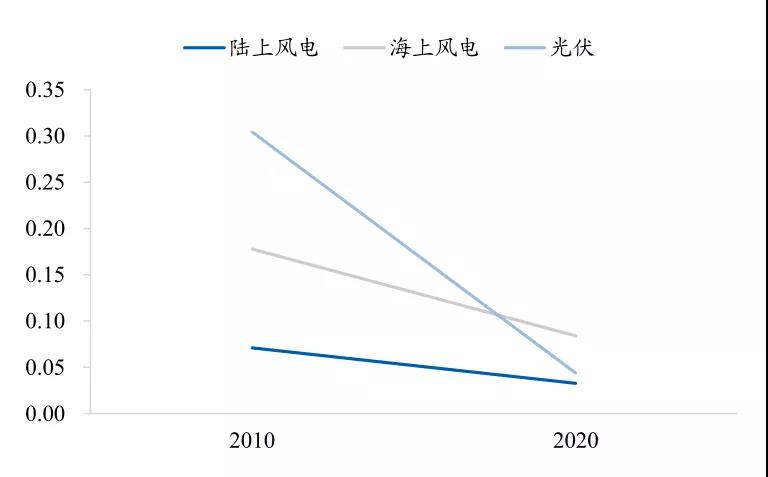 根據(jù)IRENA的統(tǒng)計,過去十年間中國陸上/海上風電的平均度電成本分別由2010年的0.071/0.178美元降至2020年的0.033/0.084美元,下降幅度為54%/53%,明顯低于同期國內(nèi)光伏度電成本的下降幅度86%。
