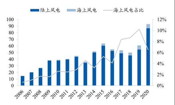 事實上,從全球范圍來看,現(xiàn)階段海上風電整體處于發(fā)展初級階段。根據(jù)全球風能理事會的統(tǒng)計,截至2020年全球海上風電累計裝機規(guī)模為35GW,在總裝機中的占比僅為6%。