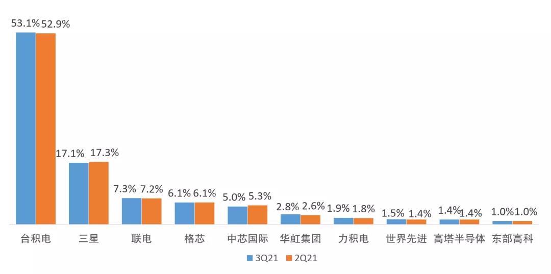 TrendForce:2021第三季全球前十晶圓代工企業(yè)市場(chǎng)份額占比排名
