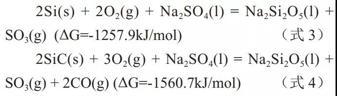 圖 2 為在 900℃ Na2CO3 和 Na2SO4 熔鹽中處理 4 h 的 SiC 陶瓷的 XRD 圖譜。可以看出, 兩種熔鹽腐蝕后, SiC 陶瓷的相組成是相同的, 主要是由 SiC 和 Si 以及少量 Na2Si2O5 組成。其中,Na2SO4 熔鹽腐蝕樣品的硅含量明顯多于 Na2CO3熔鹽腐蝕樣品的硅含量。SiC 陶瓷中的 Si 相主要來源于其制備過程中填充到孔隙的游離硅 。熔鹽腐蝕過程中, 可能發(fā)生的化學(xué)反應(yīng)包括: