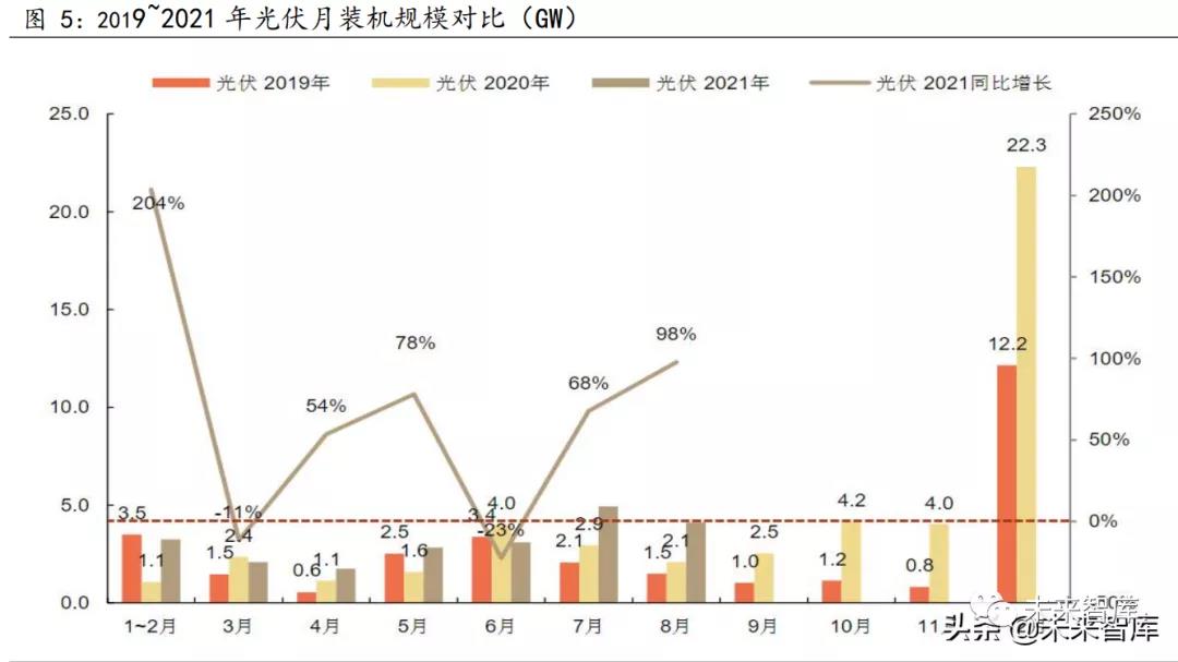 經(jīng)濟發(fā)展,社會用電量增長成為光伏產(chǎn)業(yè)規(guī)模擴張的內生動力。2021 年 1-8 月,全社會用電量累計 54704 億千瓦時,同比增長 13.8%。