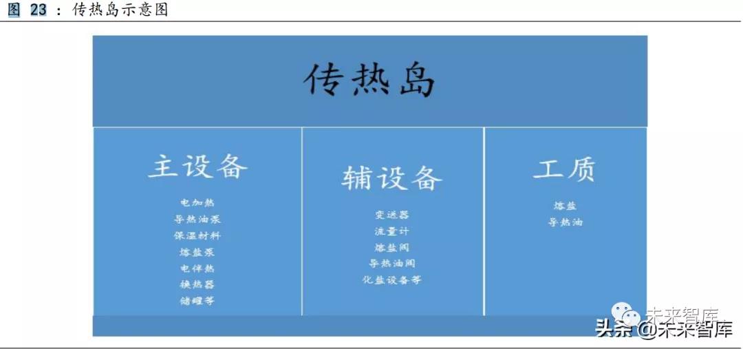 傳儲熱島則分為主設備、輔設備和工質三部分,主要涉及換熱器、熔 鹽泵、熔鹽閥、流量計、電加熱及電伴熱等裝備以及熔鹽、導熱油等傳儲 熱工質。