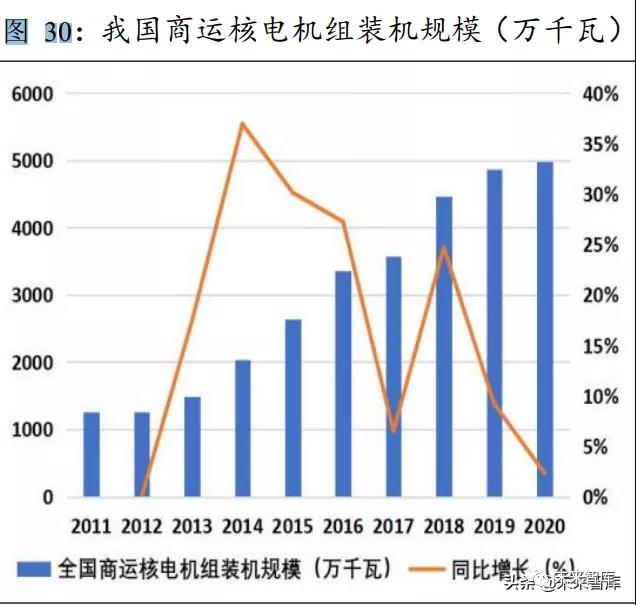 根據(jù)核電專業(yè)媒體《核電觀察》在 1 月發(fā)表的年度展望中曾測算,要 實現(xiàn) 2030 年非化石能源占一次能源消費比重 25%以上,綜合考慮風電、 太陽能、水電的發(fā)展空間以及核電的建設周期,需要十四五期間至少新開 工 3500 萬千瓦核電機組,即 30-35 臺百萬千瓦核電機組,年均新開工 6-8 臺機組,屆時至 2030 年核電裝機容量可達到 1 億至 1.1 億千瓦。