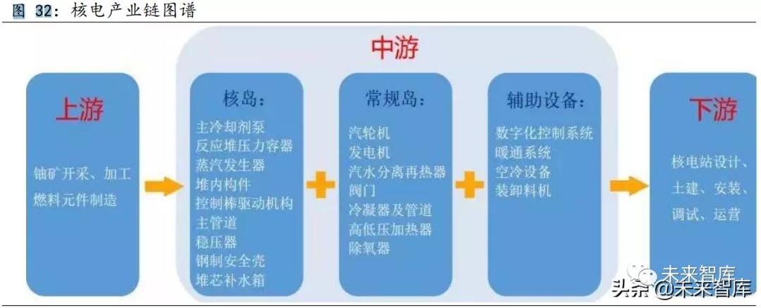 核電產(chǎn)業(yè)鏈的上游為鈾礦開采加工精煉、鈾轉化濃縮和核燃料組件制 造;中游為核電設備制造環(huán)節(jié),主要包括核島設備、常規(guī)島設備和輔助設 備;下游是核電站建設運營及乏燃料處理等。核電具有建設周期長、投資 規(guī)模大的特點,核電建設既可以發(fā)揮穩(wěn)定投資的作用又有推動未來能源結 構優(yōu)化具有重要作用。在新一輪政策的引導下,核電整個產(chǎn)業(yè)鏈發(fā)展空間 有望獲得提升。