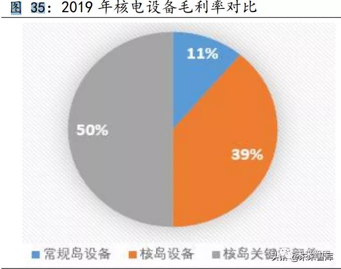 核島設備制造是核電國產(chǎn)化的核心,壟斷程度高,技術壁壘高,毛利率接近 40%。核電站建設成本占比最高,達到 64.3%,其中,核電設備 在核電站建設中所占成本最高,其比例高達 50%,而核電設備中核島成本 占比最高,達到 58%,因為核島工藝復雜,且安全性要求極高,核島中的 關鍵部件由于制造工藝要求高,制造所需資產(chǎn)均由國企壟斷。常規(guī)島與輔 助系統(tǒng)由于技術壁壘低,價格明顯下降,成本占比也相應下降,毛利率水 平僅為 10%左右。
