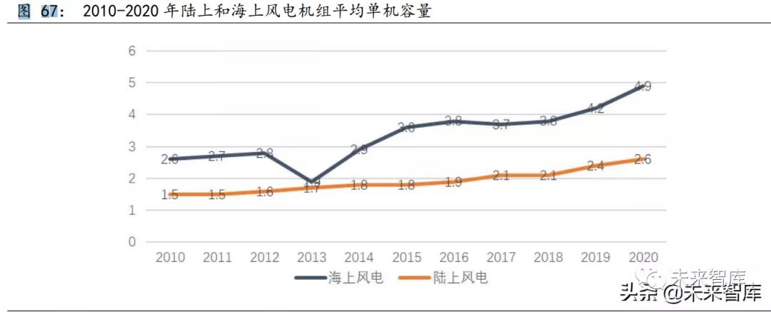 2020 年,中國陸上風電場主流機型單機容量平均為 2.6MW,其中 2.5MW 的機型占比最大,達到 40%,3MW 及以上占比為 33%。4MW-5MW 的風電機組 已小批量投產(chǎn)。海上風電場主流機型平均單機容量已達到 4.9MW。