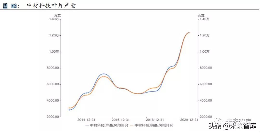 目前已上市的葉片生產(chǎn)頭部企業(yè)有中材科技和時代新材。中材科技 (002080.SZ)擁有江蘇阜寧、河北邯鄲、江西萍鄉(xiāng)、甘肅酒泉、吉林白 城、內蒙古錫林及興安盟七大生產(chǎn)基地,兆瓦級葉片生產(chǎn)能力居全國首位, 成立至今全球銷售近 65GW,年產(chǎn)能超 4000 套,2020 年市場占有率全球排 名第一。2020 年中材科技(002080.SZ)風電葉片實現(xiàn)營業(yè)收入 89.77 億元, 同比增長 78.15%。公司風電葉片業(yè)務毛利率水平整體穩(wěn)定。