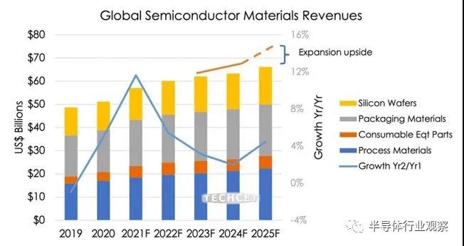 在全球轟轟烈烈進(jìn)行“造芯運(yùn)動(dòng)”的時(shí)候,作為芯片制造所需的材料市場也在極致旺盛的產(chǎn)業(yè)需求之下不斷成長。據(jù)TECHET在8月30日發(fā)布的統(tǒng)計(jì)分析數(shù)據(jù),2021年世界半導(dǎo)體材料市場將超過570億美元,同比將增長11.8%;預(yù)計(jì)到2025年約為660億美元,半導(dǎo)體材料市場銷售額平均復(fù)合增長率約為5.3%,增長最快的材料為硅晶圓、清洗材料、CMP材料和光刻膠。