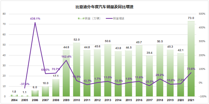 2010年之后,比亞迪就進入瓶頸期,號稱“比3萬”。每月3萬多,每年四五十萬的銷量,這種半死不活的狀態(tài)整整持續(xù)了10年,一直到2021年,比亞迪的年銷量才第一次超過2010年。