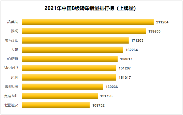 迄今為止,漢不僅僅是比亞迪最重要的一款車,也是中國自主品牌歷史上具有里程碑意義的一款車。2021年,按照工信部的上牌數(shù)據(jù),比亞迪漢以10.87萬輛的上牌量,沖進了中國B級轎車銷量排名榜的前十,排在這個榜單前面的,都是老牌的外資釘子戶,凱美瑞、雅閣,寶馬3……