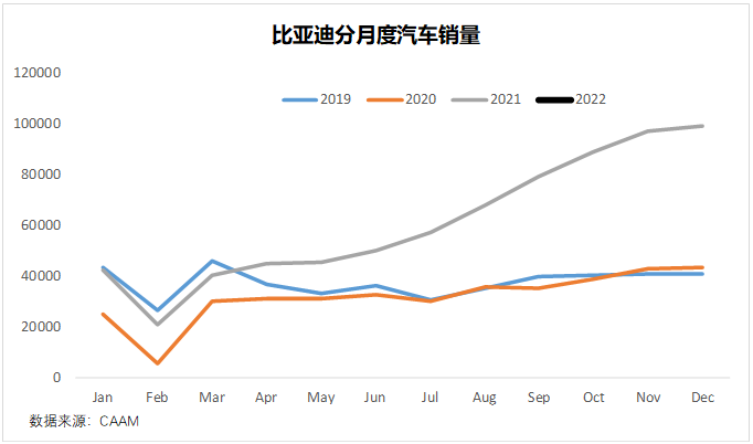 從月度銷量看,比亞迪最近3個月的月度銷量已經(jīng)接近10萬輛,假如我們簡單的線性外推,比亞迪2022年的年度銷量應(yīng)該在120萬輛左右。實際上,比亞迪公開給市場的業(yè)績指引是150萬輛,更激進當然是王傳福內(nèi)部給的200萬輛的大躍進。考慮到過去10年,王傳福在汽車上放過的衛(wèi)星不計其數(shù),能兌現(xiàn)的場景確實不多,2022年120-150萬輛的銷量區(qū)間,其實還是比較合理的。