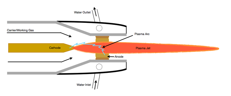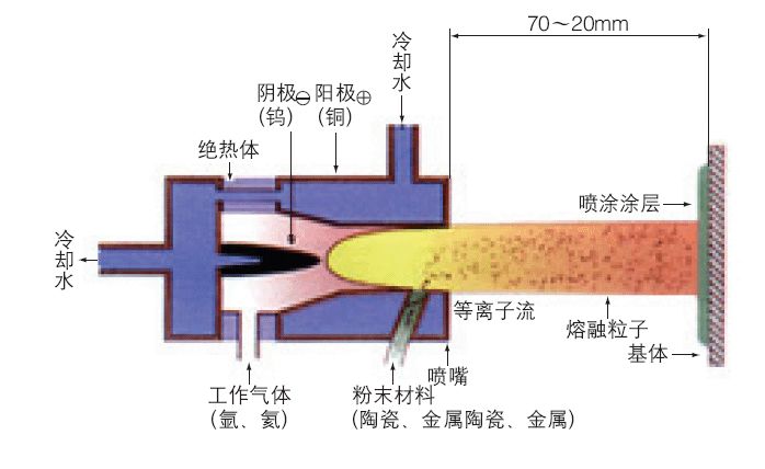 大氣等離子噴涂(APS)是應(yīng)用最早、最廣的一種熱噴涂技術(shù),整個噴涂過程在大氣環(huán)境下進行。APS通常利用Ar、N2和He作為工作介質(zhì),其核心部件是等離子噴槍,工作原理是在陽極和陰極之間通入上述工作氣體作為介質(zhì),使其電離并產(chǎn)生等離子弧,通過等離子弧的作用進一步將噴涂材料加熱至熔融或半熔融狀態(tài)后進行噴涂。