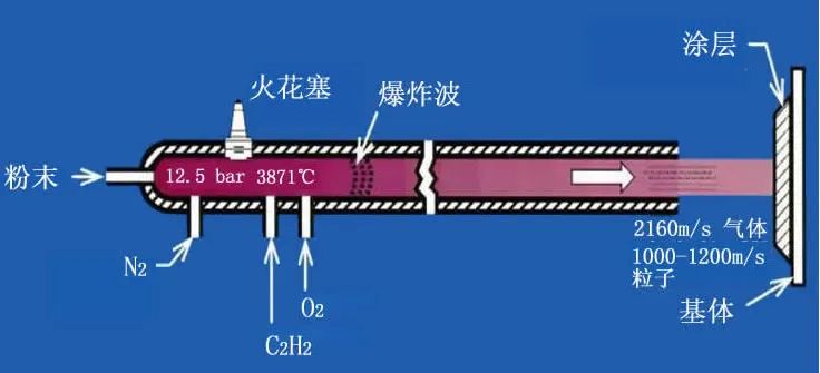 爆炸噴涂技術(shù)的原理是利用氣體爆炸后產(chǎn)生的能量將粉末原料加熱熔化,使其以極高速度沉積在工件表面,形成堅固的涂層。該技術(shù)在航空發(fā)動機等關(guān)鍵零部件修復(fù)和耐磨防護中表現(xiàn)出無法替代的優(yōu)勢,受到世界范圍的研究和重視,已成為生產(chǎn)高質(zhì)量耐磨涂層最有效的技術(shù)。