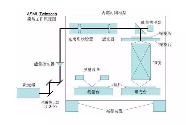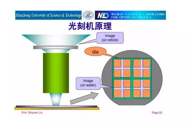 在光刻技術(shù)的原理下,人們制造了光刻機(jī),光刻機(jī)通過(guò)一系列的光源能量、形狀控制手段,將光束透射過(guò)畫(huà)著線路圖的掩模,經(jīng)物鏡補(bǔ)償各種光學(xué)誤差,將線路圖成比例縮小后映射到晶圓上,不同光刻機(jī)的成像比例不同,有5:1,也有4:1。然后使用化學(xué)方法顯影,得到刻在晶圓上的電路圖(即芯片)。