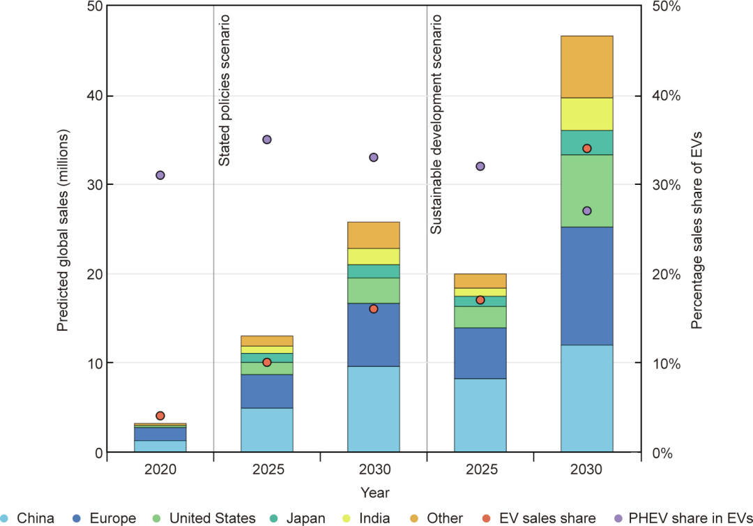 圖1 基于當(dāng)前(2020年)公布的國(guó)家政策(中間和左側(cè)欄)和可持續(xù)發(fā)展形勢(shì)(右側(cè)欄),預(yù)計(jì)電動(dòng)汽車國(guó)際銷量如圖所示。橙色圓圈代表電動(dòng)汽車銷量占汽車總銷量的比例,紫色圓圈代表插電式混合動(dòng)力電動(dòng)汽車(PHEV)銷量在所有電動(dòng)汽車銷量中所占的比例。來(lái)源:International Energy Agency,經(jīng)許可。
