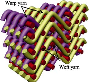 SiCf/SiC 復(fù)合材料的制造方法為有機前驅(qū)體浸漬熱解( Polymer Impregnation and Pyrolysis, PIP),其預(yù)制體編織方式為 2.5D 編織, SiC 纖維采用彎交淺聯(lián)方式編織,其結(jié)構(gòu)如圖 1 所示。預(yù)制體的緯向纖維束基本為平直纖維束,無任何擾動,而經(jīng)向纖維束以緯向纖維束為基軸,呈 S 形連續(xù)擾動分布。預(yù)制體的尺寸約為 200 mm×150 mm×30 mm,編織好后采用CVD 法制備 PyC 界面層,然后利用主鏈含 Si 和 C 的有機前驅(qū)體溶液浸漬預(yù)制體,經(jīng)交聯(lián)固化成形后,高溫?zé)Y(jié)成 SiC 基體。復(fù)合材料拉伸試樣尺寸為 ?25 mm×5.5 mm, 試樣的拉伸方向平行于厚度( 5.5 mm) 方向。為了更好地考核涂層的結(jié)合性能,加工后的試樣5.5 mm方向平行于預(yù)制體的徑向, ?25 mm 的面平行于預(yù)制體的緯向。