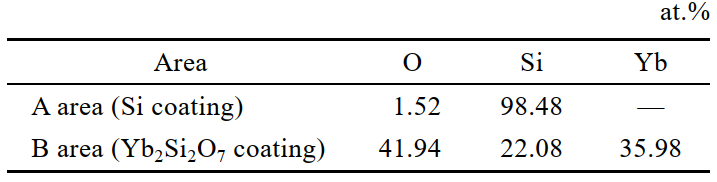 Si/Yb2Si2O7雙層涂層的結(jié)合強度( (26.23±3.13) MPa)略低于單層 Si 涂層的結(jié)合強度( (30.48±4.43) MPa)。分析原因是,從斷口形貌來說,雙層涂層在拉伸過程中,被拉開的 SiCf/SiC 復(fù)合材料相對較少,且未發(fā)現(xiàn)粘結(jié)膠明顯被拉開, 從而使雙層涂層在拉伸過程中顯示的結(jié)合強度值降低。Yb2Si2O7 涂層的孔隙率約為5.2%,與 Si 層相比,孔隙等缺陷含量相對較高,這不利于涂層的結(jié)合強度, 且 Yb2Si2O7 涂層中含有一定的 Yb2O3 相。Yb2O3 的熱膨脹系數(shù)為 6.8×10–6~8.5×10–6 ℃ –1,與 Yb2Si2O7、 Si、 SiCf/SiC 的熱膨脹系數(shù)相差較大,會增加涂層的應(yīng)力,也可能降低涂層的結(jié)合強度。