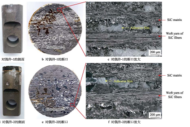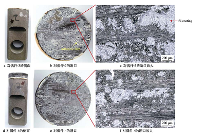 Si 涂層拉伸試驗后的宏觀與斷面形貌如圖 10 所示。對偶件示。對偶件-3(見圖 10a)側(cè)面上方?jīng)]有明顯厚度的SiCf/SiC 復(fù)合材料或 Si 涂層,對偶件-4(見圖 10d)側(cè)面上方粘有試樣。從對偶件側(cè)面觀察可知,加有Si 涂層的復(fù)合材料在拉伸過程中, 斷裂位置主要在涂層或者涂層與復(fù)合材料的界面位置。在 2 個斷面的宏觀斷口(見圖 10b、 e)均可以看到條狀紋路和粘結(jié)膠,由于粘有 Si 涂層,粘結(jié)膠的顏色較淺。在斷口放大形貌(見圖 10c、 f)觀察到 Si 層、大量絲狀緯向 SiC 纖維和灰黑色 SiC 基體。以上觀察結(jié)果表明,含 Si 層的 SiCf/SiC 復(fù)材在拉伸過程中,部分 Si 層、復(fù)材的 SiC 基體、粘結(jié)膠都發(fā)生了斷裂,且復(fù)材表面部分緯向的 SiC 纖維沿拉伸方向被拉開。