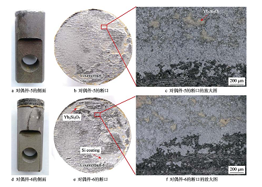 與 Si 涂層拉伸原因相似, Si/Yb2Si2O7 雙層涂層與 SiCf/SiC 復(fù)材結(jié)合強度高的原因主要為:1) SiCf/SiC復(fù)材沿拉伸方向強度較高, Si 層與復(fù)合材料結(jié)合強度高;2)本文采用的真空等離子噴涂,有利于減少涂層內(nèi)的微觀缺陷,從而提高了涂層與基體之間的黏結(jié)強度以及涂層自身的內(nèi)聚強度;3) Yb2Si2O7 的熱膨脹系數(shù)為 3.3×10–6~5.2×10–6 ℃ –1,與 Si、 SiCf/SiC 的熱膨脹系數(shù)相近;4) Si 層與 Yb2Si2O7 層的化學(xué)相容性好,有利于 Yb2Si2O7 在 Si 涂層表面的鋪展和結(jié)合。