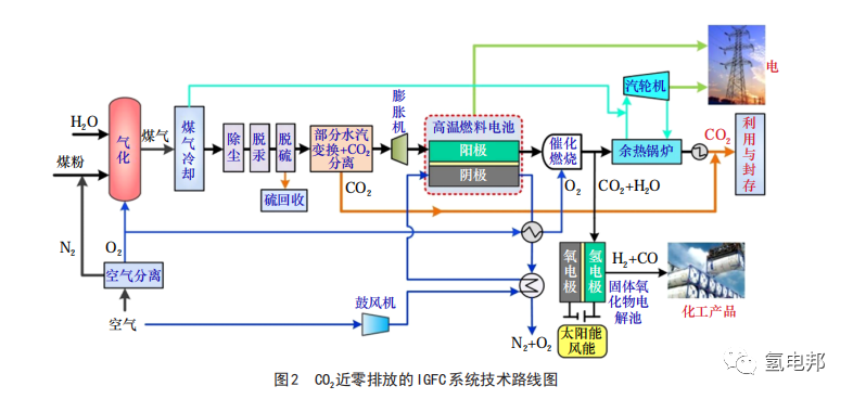 在固體氧化物燃料電池技術(shù)應(yīng)用場(chǎng)景方面,IGFC 技術(shù)有助于實(shí)現(xiàn)煤炭的清潔高效利用,是煤炭領(lǐng)域的變革性技術(shù)。為推進(jìn)IGFC相關(guān)技術(shù)攻關(guān)和工程示范,科學(xué)技術(shù)部在2017年立項(xiàng)了國(guó)家重點(diǎn)研發(fā)計(jì)劃 “CO2近零排放的煤氣化發(fā)電技術(shù)”,由國(guó)家能源集團(tuán)牽頭,聯(lián)合中國(guó)礦業(yè)大學(xué)(北京)、中國(guó)華能集團(tuán)清潔能源技術(shù)研究院有限公司、清華大學(xué)等單位組成“產(chǎn)學(xué)研”攻關(guān)團(tuán)隊(duì),其核心任務(wù)是開(kāi)發(fā)高溫固體氧化物燃料電池和固體氧化物電解池技術(shù),建成 CO2近零排放的 IGFC 示范工程,項(xiàng)目總體技術(shù)路線如圖2所示。IGFC系統(tǒng)一般由煤氣化凈化、高溫燃料電池發(fā)電、余熱回收及CO2捕集和封存等子系統(tǒng)構(gòu)成,其中高溫燃料電池發(fā)電技術(shù)是制約IGFC發(fā)展的關(guān)鍵技術(shù)。項(xiàng)目組目前已開(kāi)發(fā)了固體氧化物燃料電池電堆和IGFC測(cè)試平臺(tái),已實(shí)現(xiàn)了20千瓦級(jí)IGFC發(fā)電系統(tǒng)試車,下一步將依托已有技術(shù)開(kāi)展100千瓦級(jí)IGFC發(fā)電系統(tǒng)示范 [12]。目前,國(guó)內(nèi)IGFC仍處于起步階段,煤氣凈化提純技術(shù)、高溫燃料電池技術(shù)、系統(tǒng)耦合控制技術(shù)等相關(guān)技術(shù)研究正逐步開(kāi)展。高溫固體氧化物燃料電池技術(shù)是制約IGFC發(fā)展的關(guān)鍵技術(shù),目前,國(guó)內(nèi)的固體氧化物燃料電池技術(shù)尚未完全成熟,一方面應(yīng)加強(qiáng)基礎(chǔ)研究,另一方面要重點(diǎn)開(kāi)展關(guān)鍵技術(shù)攻關(guān),降低成本,提高壽命。