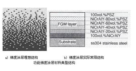 在熱障涂層中,由于粘結(jié)層金屬和氧化鋯陶瓷的熱膨脹系數(shù)差異較大,這種差異將導致涂層內(nèi)應力過大,并且在熱循環(huán)條件下常發(fā)生陶瓷涂層的早期破壞。為了減小內(nèi)應力,提高涂層與基體的結(jié)合強度,材料科學家開始在常規(guī)熱障涂層中引入功能梯度材料制備技術(shù)。