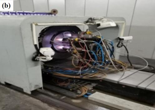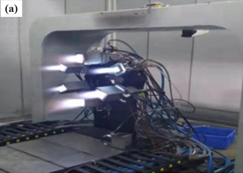 為了解決熱障涂層地面試車前考核評價平臺缺失、 關(guān)鍵損傷參數(shù)不清的難題, 研制了渦輪葉片熱障涂層熱力化耦合動態(tài)試驗模擬與測試裝置。裝置通過高速電機帶動載有渦輪盤的主軸旋轉(zhuǎn),超音速燃氣噴槍使用航空煤油做燃料, 純氧做助燃劑, 噴槍在導軌的帶動下可深入燃燒室對旋轉(zhuǎn)的渦輪葉片進行加熱, 渦輪葉片最大旋轉(zhuǎn)直徑為460 mm。 圖 1(a)、 (b) 分別為同時點燃六把燃氣噴槍和噴槍深入燃燒室效果圖。 試驗選擇 6000 r/min、 1000 ℃ 作為主要考核工況, 即渦輪葉片以6000 r/min 速度旋轉(zhuǎn)時熱障涂層表面最高溫度需要達到 1000℃。 一次熱沖擊循環(huán)包括升溫、 保溫階段共 5 min 和降溫階段 5 min。 實驗開始前渦輪葉片以預定轉(zhuǎn)速旋轉(zhuǎn), 點燃的噴槍在導軌上前進時開始計時。 保溫階段結(jié)束后, 噴槍從燃燒室中移出熱障涂層開始降溫, 降溫過程結(jié)束后葉片停止旋轉(zhuǎn)。 為分析不同服役轉(zhuǎn)速對涂層表面溫度以及應變損傷的影響, 對比轉(zhuǎn)速選擇 5000 r/min 和4000 r/min。