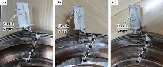 圖 3 在不同角度安裝應變計的熱障涂層葉片: (a) 0° ; (b) 45° ; (c) 90°