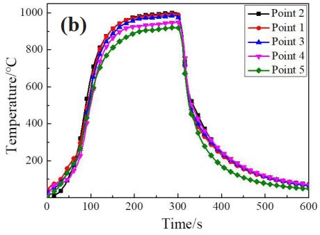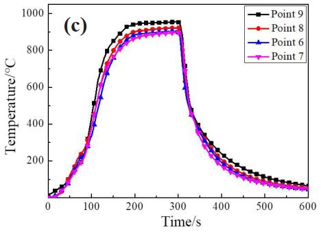 由圖 4 溫度測點和截面各點時間溫度變化曲線可知, 點1~5的最高溫度分別是992 ℃、 1000 ℃、985 ℃、 948 ℃和 921 ℃, 點 6~9 的最高溫度分別是 905 ℃、 897 ℃、 921 ℃、 956 ℃。 整體上, 吸力面溫度高于壓力面, 前緣的溫度高于尾緣, 其中溫度最高的位置出現(xiàn)在吸力面靠近前緣處( 測點 2, 1000 ℃) 、 最低位置在壓力面尾緣( 測點7, 897 ℃) 。 這是因為在葉片旋轉(zhuǎn)過程中, 高溫燃氣率先在吸力面與渦輪葉片發(fā)生交互作用, 吸力面被加熱的更充分; 前緣靠近焰心并且正對火焰沖擊, 所以在前緣整體溫度大于尾緣。 在噴槍未完全進入燃燒室之前溫升速率較慢, 隨后升溫速率顯著提高, 最終各測點相繼達到穩(wěn)定狀態(tài)。