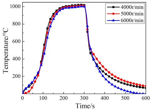 圖 5 為測溫點 2 以表 1 參數(shù)加熱時不同轉(zhuǎn)速下的溫度變化曲線, 在下的溫度變化曲線, 在 6000 r/ min、5000 r/min、4000 r/min 的穩(wěn)定溫度分別為 1000 ℃、1013 ℃、1022 ℃。可以看出,加熱參數(shù)不變時隨著轉(zhuǎn)速的降低, 溫度呈小幅升高的趨勢。 這是因為受尾跡導流的影響, 轉(zhuǎn)速越高渦輪葉片承受的風阻越大,帶走的熱量越多, 所以涂層表面溫度越低。 與此同時, 周圍相對低溫的氣流會在葉片表面形成“冷卻氣膜”, 轉(zhuǎn)速越高低溫氣流的冷卻效果便越顯著。