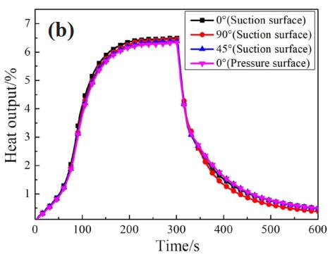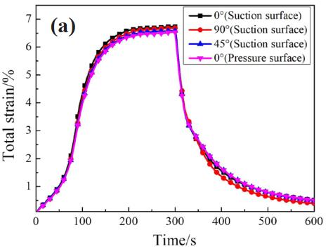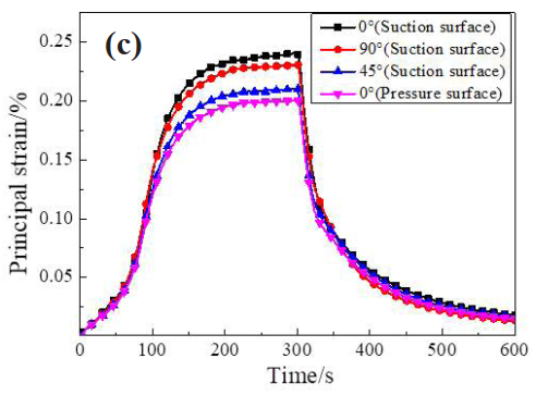 如 圖 7 所 示 為 1000 ℃、 6000 r/min 測 試 狀態(tài)下, 4 個應變測點應變總量曲線 (a)、 熱輸出曲線 (b) 和二者作差得到的主應變曲線 (c)。 對保溫時穩(wěn)定狀態(tài)的應變進行分析, 可見熱輸出在應變總量中占比很高。 由圖 7(c) 可知, 吸力面主應變(0.23%) 大于壓力面 (0.20%), 在不同的安裝角度,0°、 90°、 45° 方向的主應變分別為 0.24%、 0.23%、0.21%。 吸力面溫度高具有更大熱應力, 同時也承受著更多的氣流沖擊, 因此主應變高于壓力面。應變計示值反應的是應變計敏感柵接觸范圍內(nèi)的總變形, 安裝方向平行于緣板 (0°) 時截面方向溫度梯度高、 敏感柵所受應變梯度大, 因此形變量最大。 垂直于緣板方向 (90°) 的應變梯度較小但與燃氣的接觸面積變大、 受到更多剪切式氣流沖刷, 因此在多重機制共同作用下, 0° 方向應變大于 90° 大于 45°。