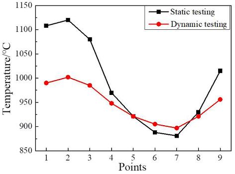 為了對比動態(tài)、 靜態(tài)服役過程中熱障涂層表面溫度場差異, 使用同規(guī)格樣品, 在靜態(tài)熱沖擊實驗臺開展了對照實驗。 靜態(tài)測溫通過紅外熱像儀實現(xiàn), 測溫點的選取與動態(tài)一致, 燃氣噴槍對準測溫點 2 加熱, 以保證此位置為溫度最高。 與此同時, 為了便于對比動、 靜態(tài)熱沖擊循環(huán)過程的主應變演化, 需調(diào)節(jié)靜態(tài)測試的主控溫度使動、靜態(tài)測試時葉背尾緣測點 5 的溫度變化一致。 圖9 為動、 靜測試保溫狀態(tài)下各測點的溫度分布,與高速旋轉(zhuǎn)熱沖擊相比, 維持葉背尾緣溫度相同時, 靜態(tài)測試的前緣溫度高達 1123 ℃, 截面溫差242 ℃ 遠大于動態(tài)考核的 103 ℃。 動態(tài)測試時渦輪葉片處于環(huán)境溫度較高的燃燒室中, 且高速旋轉(zhuǎn)下火焰對葉片的加熱更為均勻, 而靜態(tài)熱沖擊時, 遠離噴槍口的尾緣受周圍低溫環(huán)境的影響升溫緩慢, 終態(tài)溫度也較低, 因此動靜、 態(tài)測試的截面溫度分布存在明顯差異。