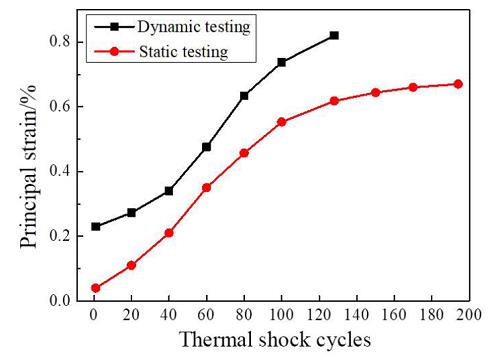 為了分析熱障涂層失效的損傷演變過程及其失效機理, 對動、 靜態(tài)熱循環(huán)過程進行了應變損傷演化的實時檢測。 綜合考慮應變測點的穩(wěn)定性與典型性, 選擇在吸力面 90° 安裝的應變計對熱循環(huán)過程進行應變采集。 涂層失效判定條件為剝落面積達到 10% 或剝落長度大于 10 mm, 每 20次循環(huán)進行一次采樣繪制。 圖 10 為帶熱障涂層渦輪葉片動態(tài)與靜態(tài)熱沖擊循環(huán)考核過程中最大主應變演化曲線。 圖中可以看出, 動態(tài)熱沖擊主應變在 0.23%~0.82% 之間, 靜態(tài)熱沖擊主應變在0.04%~0.67% 之間, 均為拉伸變形。 動態(tài)熱沖擊實驗熱障涂層經(jīng)歷 128 次循環(huán)剝落失效, 低于靜態(tài)測試的 194 次, 但失效前最大主應變高于靜態(tài)。在動態(tài)與靜態(tài)熱沖擊循環(huán)考核過程中, 雖然測點的溫度變化一致, 但動態(tài)測試在高速旋轉(zhuǎn)過程需要承受氣流激振力與離心力等多種復雜載荷, 因此相同循環(huán)次數(shù)下的主應變高于靜態(tài)。 對比失效前最后的應變狀態(tài), 二者主應變差值有所減小,說明涂層的剝落失效是疲勞損傷的累積過程, 剝落時最大主應變需要達到一定的臨界條件。