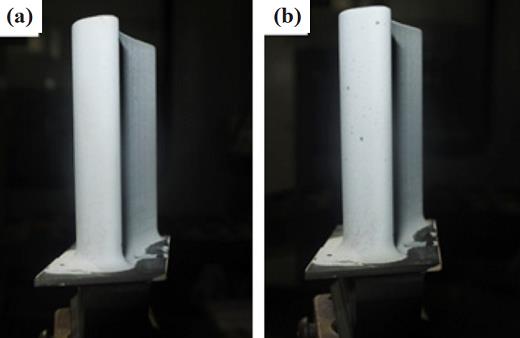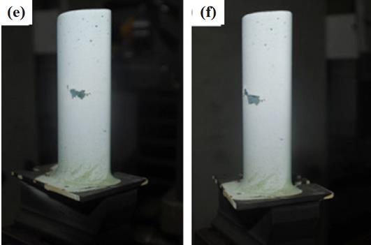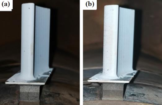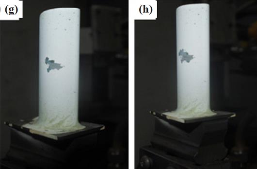 如圖 11 所示為熱障涂層在動態(tài)熱沖擊循環(huán)下的宏觀形貌演變。 測試前熱障涂層表面光滑整潔,由于存在煤油燃燒產(chǎn)物的沉積, 隨著循環(huán)次數(shù)的增加表面逐漸暗淡。 熱循環(huán) 60 次后, 熱障涂層開始出現(xiàn)剝落, 剝落區(qū)域集中在受燃氣沖刷較為嚴重的吸力面前緣中上部。 隨著熱循環(huán)的進行, 剝落區(qū)域逐漸向周圍蔓延, 葉冠附近剝落最為嚴重。循環(huán) 128 次時剝落面積達到總面積的 10%, 涂層已經(jīng)失效。 圖 12 所示為靜態(tài)熱沖擊循環(huán)時熱障涂層的宏觀形貌演變, 原始形貌仍然干凈整潔, 隨著熱循環(huán)的進行, 涂層表面出現(xiàn)黑色斑點。 循環(huán)90 次時, 涂層表面出現(xiàn)可見裂紋, 裂紋位置為正對燃氣沖擊區(qū)域。 隨后剝落面積逐漸擴大最終在194 次熱循環(huán)后失效, 但剝落區(qū)域未向葉冠擴散。對比發(fā)現(xiàn), 熱沖擊循環(huán)考核過程中熱障涂層率先剝落區(qū)域均為受外力沖擊最大且溫度最高的位置,然后向周圍擴展。 當存在離心載荷時, 熱障涂層的剝落位置會向離心力最大的葉冠方向擴散。