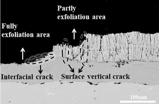圖 13 動態(tài)熱沖擊循環(huán)失效后熱障涂層的微觀結(jié)構(gòu)