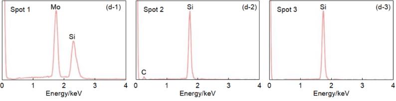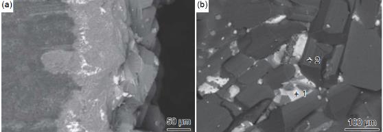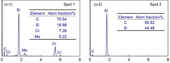 圖3 SiC-CrSi2-Cr3C2-MoSi2-Mo2C 涂層的形貌和相組成 (a)橫截面圖像;(b)表面圖像;(c-1)點 1 對應的 EDS 分析;(c-2)點 2 對應的 EDS 分析