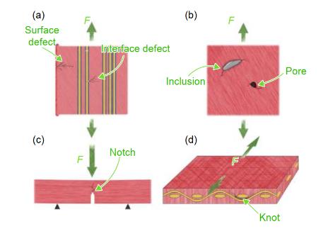 SiC/SiC 復(fù)合材料從損傷發(fā)生到最終破壞主要經(jīng)歷基體橫向開裂、層間開裂、纖維束與基體分離、纖維束內(nèi)基體開裂、纖維斷裂與拔出等損傷模式。裂紋萌生、擴(kuò)展直至發(fā)生破壞的方式同纖維預(yù)制體結(jié)構(gòu)或鋪層方式、界面層的類型及其與纖維和基體的結(jié)合強(qiáng)度、基體缺陷等密切相關(guān)。表面和界面缺陷、內(nèi)容物和孔洞、人工狹縫或缺口尖端、編織結(jié)節(jié)等應(yīng)力集中部位容易成為裂紋萌生點(diǎn),如圖 2 所示。由于缺陷的廣泛存在,基體裂紋往往在比例極限以下即可發(fā)生;但是在很低應(yīng)力水平下發(fā)生的基體裂紋并不一定直接影響材料的性能。