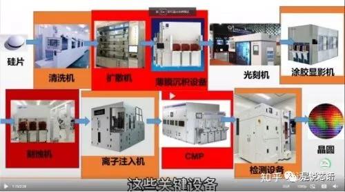 氧化擴(kuò)散機(jī),薄膜沉積設(shè)備,光刻機(jī),涂膠顯影機(jī),刻蝕機(jī),離子注入機(jī),CMP拋光設(shè)備,檢測(cè)設(shè)備,總共是八大設(shè)備。除此之外,還有一個(gè)清洗機(jī),貫穿多個(gè)工序,不清洗是沒辦法進(jìn)入下一環(huán)節(jié)的,因此總共是九大核心設(shè)備。