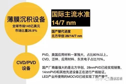 薄膜沉積設(shè)備領(lǐng)域最強(qiáng)的是美國(guó)和日本,都可以搞定5nm技術(shù),兩國(guó)合計(jì)占據(jù)70~80%左右的市場(chǎng)份額。目前,中國(guó)國(guó)內(nèi)的存量薄膜沉積設(shè)備98%來自于進(jìn)口,國(guó)產(chǎn)化率僅為2%,因?yàn)橹袊?guó)以前造不出來。但最近幾年,中國(guó)取得了技術(shù)突破,最先進(jìn)廠商為北方華創(chuàng)。目前,中國(guó)28nm級(jí)別的設(shè)備已經(jīng)成功實(shí)現(xiàn)銷售,14nm設(shè)備正在生產(chǎn)線進(jìn)行磨合驗(yàn)證。