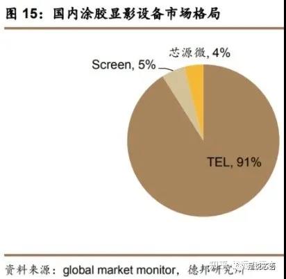 全球涂膠顯影設(shè)備市場(chǎng)中,日本TEL這一家公司的市占率達(dá)到87%,達(dá)到了絕對(duì)壟斷地位。DNS公司,西美事公司,SCREEN公司,這三家公司合起來才占了13%。這個(gè)領(lǐng)域中外差距極大,以前根本就沒有中國(guó)公司什么事。目前涂膠顯影設(shè)備中國(guó)已經(jīng)取得了突破,芯源微和沈陽芯源可以制造國(guó)產(chǎn)替代產(chǎn)品,目前已經(jīng)達(dá)到了28nm的工藝水平,14nm設(shè)備即將研發(fā)成功。在中國(guó)國(guó)內(nèi)市場(chǎng),只有芯源微打開了市場(chǎng),目前占據(jù)了4%的市場(chǎng)銷售額,國(guó)際市場(chǎng)暫時(shí)就不想了。